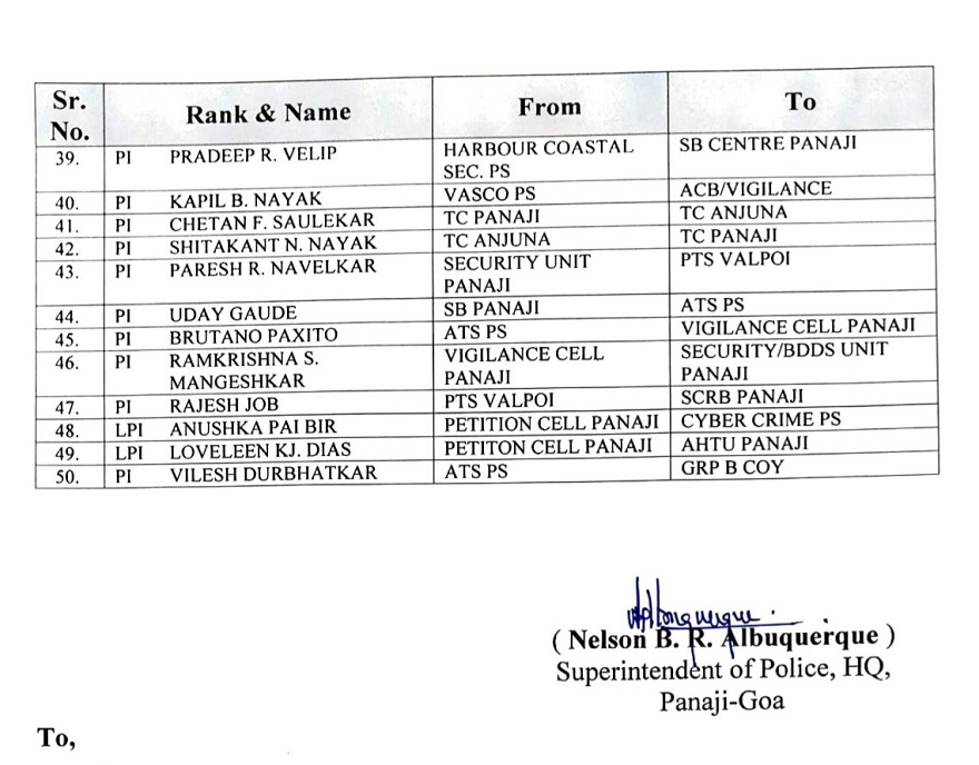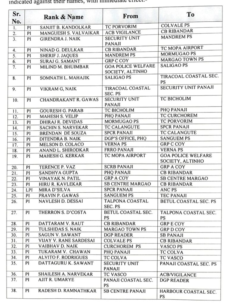 बदली जाल्ल्या पुलीस निरीक्षकांचीं नांवां सकयल दिल्ले प्रमाण: