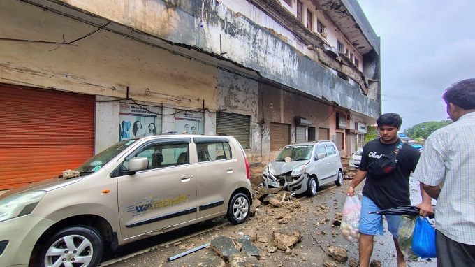 मडगांव : मडगांव गांधीमार्केटा लागसारच्या आदल्या बँक ऑफ इंडियाचो फांटो आशिल्लो, ते पडपाचे अवस्थेंत आशिल्ले इमारतीचो कांय भाग पावसाक लागून कोसळ्ळो. हातूंत पार्क करून दवरिल्ल्या तीन गाडयांचें लुकसाण जालें. तांतले एके गाडयेंत बशिल्लो चलो वाटवलो. अतिरिक्त जिल्लोधिकारी, आमदार हांच्या पळोवणे उपरांत मोडपाक आयिल्लो भाग काडून ही इमारत सील करपाचे निर्देश दिल्यात.
