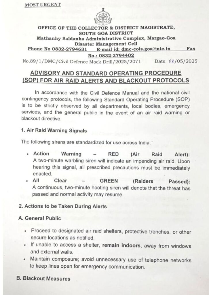 मडगांव ः भारत आनी पाकिस्तान तणावाच्या फाटभुंयेर दक्षीण गोंय जिल्लोधिकाऱ्यांनी हवाई हल्लो आनी ब्लॅकआउट आदेश जारी जाल्यार नागरी संरक्षणा खातीर कांय मार्गदर्शक तत्वां जारी केल्यांत. थळाव्या संस्थांनी, आपत्कालीन सेवांनी आनी सामान्य लोकांनी नागरी संरक्षण नेम आनी राष्ट्रीय नागरी आकस्मिक शिष्टाचारा प्रमाण नेमांक खरपणान पाळो दिवचो अशें सांगलां.