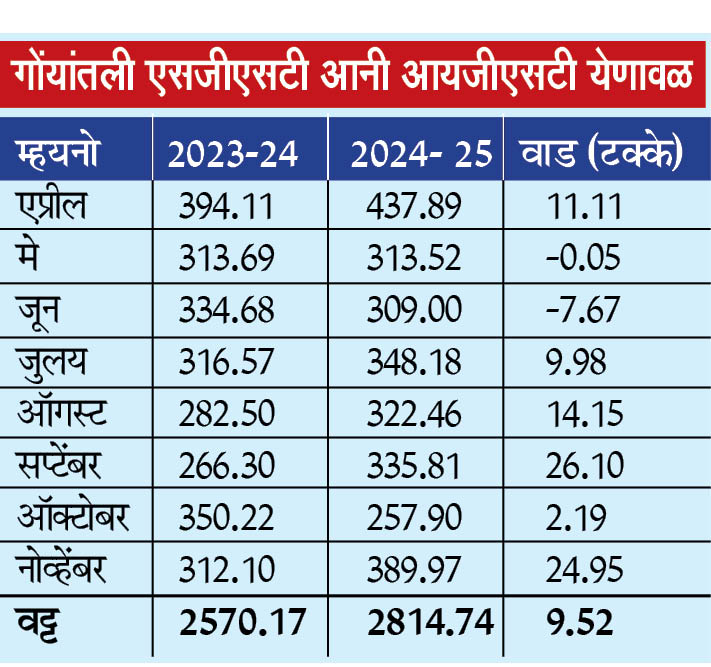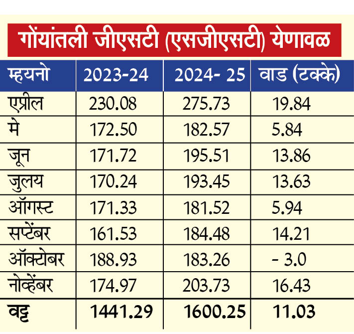 पणजी : गोंयांत एप्रील ते नोव्हेंबर ह्या 8 म्हयन्यांत 2815 कोटींची जीएसटी येणावळ एकठांय जाल्या. पोरूं (2023 – 24) एप्रील ते नोव्हेंबर ह्या 8 म्हयन्यांत 2570 कोटींची जीएसटी येणावळ एकठांय जाल्ली. पोरूंचे तुळेंत अंदूं 8 म्हयन्यांत 245 कोटींची चड येणावळ एकठांय जाल्या. हें प्रमाण 9.52 टक्के चड आसा. हातूंत राज्यांतर्गंत जीएसटी (एसजीएसटी) आनी आंतरराज्य जीएसटी (आयजीएसटी) ह्या दोगांचोय आस्पाव आसा.